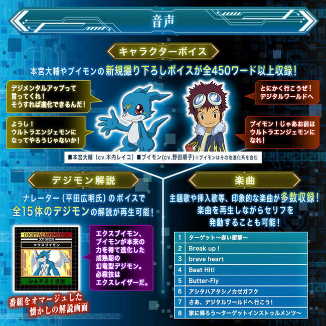 また、多彩なキャラクターボイスを収録。「ver.本宮大輔」には本宮大輔とパートナーデジモンのブイモン(その進化系を含む)の、「ver.一乗寺賢」には一乗寺賢とパートナーデジモンのワームモン(その進化系を含む)の新規撮り下ろしボイスを多数収録しています。