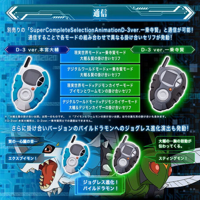 アニメ『デジモンアドベンチャー02』より、「本宮大輔」「一乗寺賢」が使用する「D-3」が商品化。2つを通信することで掛け合い台詞が発動。