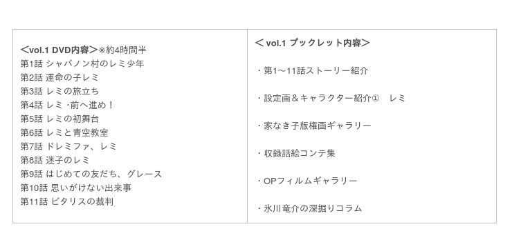 vol.1には第1回から第11回までを収録。貧しくとも母と幸せに暮らしていたレミは、出稼ぎから帰って父によって旅芸人・ビタリス一座に売られてしまいます。厳しいビタリスとともに辛い旅路を強いられるレミ。果たして彼はこの過酷な運命を生き抜いていけるのか。