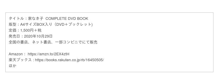 本日10月29日、ぴあ株式会社より、『家なき子COMPLETE DVD BOOK vol.1』が発売となりました。