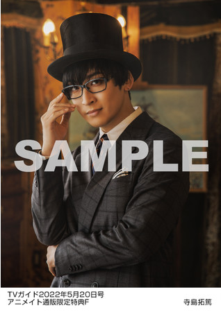 また、アニメイト通販にて「TVガイド関東版2022年5/20号」を購入すると、特典として寺島拓篤の生写真がプレゼントされる限定企画も。優雅にスイーツタイムを楽しんでいるようなショット、シルクハットを被ってクールにキメているカット、白いバラや本を持っていたり、バイオリンを抱えているポーズなど、全6種類の絵柄のなかから1枚を選ぶことができる。