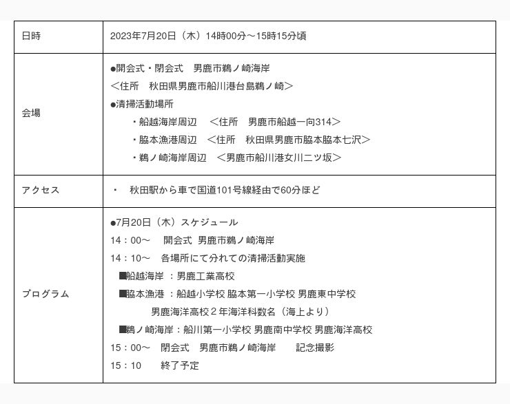 2023年7月20日(木)14時〜<開催場所:男鹿市 鵜ノ崎海岸、船越海岸、脇本漁港近辺>