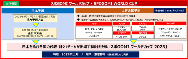 本チームは、2023年10月に東京都内での開催を予定している、全国47都道府県の予選大会を勝ち抜いたチームが出場する全日本大会「スポGOMI ワールドカップ 2023 日本 STAGE」に進出。2023年11月に日本で開催予定で、日本を含め世界21カ国の代表が集う「スポGOMI ワールドカップ 2023」への出場を目指します。