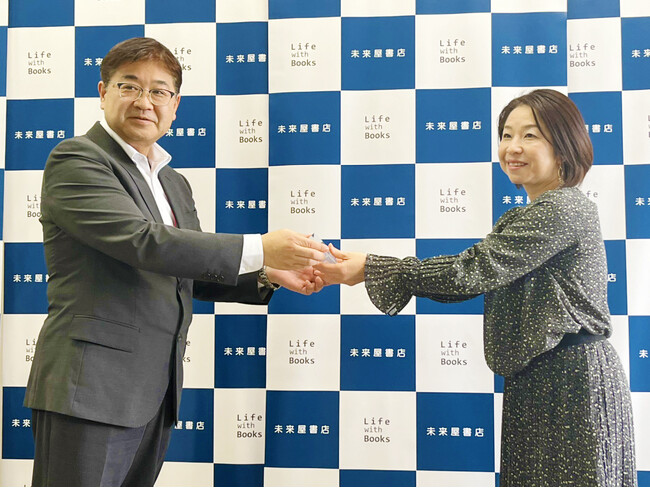 松田社長は、「風景の描写、あの子(主人公)の心の描写が細やかで、身内の女の子が成長して行く気持ちで読ませて頂いた。物語の舞台となった北海道の江別には未来屋書店が2店舗ある。店舗近くのインターを降りた道路が、作品のある大事な場面だったのではと想像しました。本当に素晴らしい作品を提供頂けたので、全国で自信を持ってお客様におすすめしていきたい」と作品を絶賛。藤岡さんは、目を潤ませながら「候補作に入っただけでも本当に嬉しかった。受賞の報告を聞いた際には矢で撃たれたような衝撃で驚き、号泣してしまいました。物語をちゃんと読んで頂けてとても嬉しい。作家生活15年目のこれまでのご褒美と、これからのエールと思ってさらに頑張っていきたいです」と感謝の気持ちを伝えました。