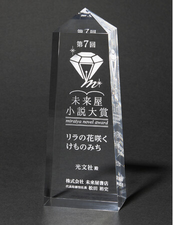 12月27日、第7回未来屋小説大賞の授賞式が未来屋書店本社にて実施され、松田裕史代表取締役社長から記念のクリスタルトロフィーと賞状が藤岡さんに授与されました。