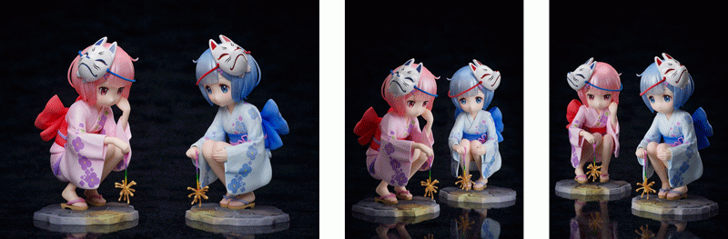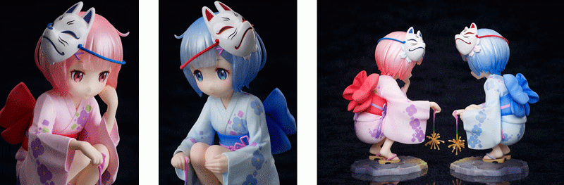 今回「F:NEX」では、サイトオープン第1作目で発売し好評を得た幼少期のラムとレムを新たに「F:NEX」オリジナルデザインの浴衣衣装でフィギュア化。ラムとレム、それぞれのイメージカラーで作られた浴衣はシワや素材の質感を造形で表現し、帯やリボン、下駄はもちろん、互いに反対のイメージカラーとなる狐のお面をつけることで、それぞれが相手を思い合う気持ちなど細部に至るまでこだわり丁寧に仕上げました。また、パール塗料を施した髪の毛は光を受けてキラキラと輝き、線香花火はクリア素材を使用することで火花が散る美しい様子を表現しています。仲むつまじく寄り添い合う、小さく可愛い幼少期のラムとレムがお手元でお楽しみいただけます。