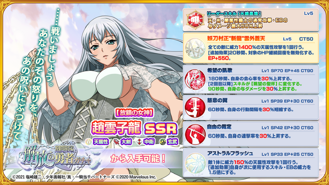 本日開始の「「解放の勇者ガチャVol.1」では新たに「【放鎖の女神】趙雲子龍」(CV: 浅川 悠)が登場!