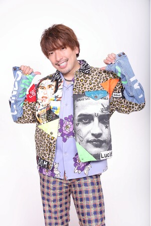 本キャンペーンのために大きめのスーツケースでリユースファッションアイテムを撮影現場に持ち込んだEXITりんたろー。