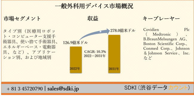 一般外科用デバイス市場は、2022年に126.9億米ドルの市場価値から、2031年までに278.0億米ドルに達すると推定され、2022-2031年の予測期間中に10.3%のCAGRで成長すると予想されています。