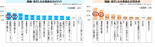 直近5年間でアルバイトの職場での服装や身だしなみの規定について緩和状況を聞いたところ、「直近5年間で緩和済み」は36.7%となった。また、緩和済み企業にメリットを聞いたところ、「従業員のモチベーション維持に繋がる」が33.7%と最も高く、次いで「応募者が増える」が30.2%、「個性を活かして働いてもらえる」が29.8%となった。一方で、緩和をしていない企業に懸念点を聞いたところ、「お客さんに不快感を与えてしまう・印象が悪い」が54.0%と最も高く、次いで「清潔感や衛生面」が45.5%となった。【図6、7】