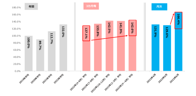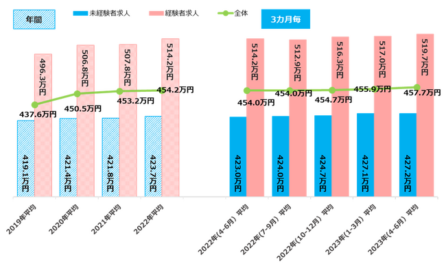 23年4-6月の平均初年度年収は457.7万円で、コロナ影響前の2019年から20.1万円の増加求人件数は2019年平均比142.6%で前年同時期から15.5ptの大幅増加