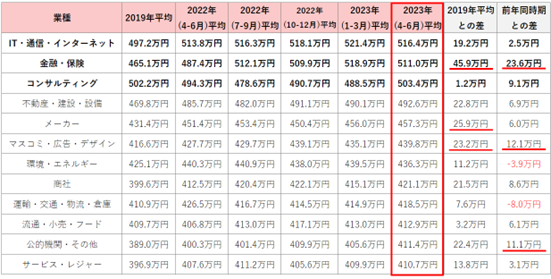 前年同時期の2022年4-6月平均と比較すると、全12業種中10業種が増加しており、特に「金融・保険」は23.6万円増で最も増加額が高かった。次いで「マスコミ・広告・デザイン」が12.1万円増、「公的機関・その他」は11.1万円増となった。【図4】