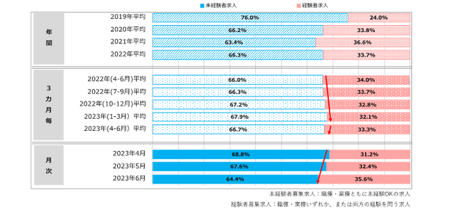 また正社員は夏ボーナス後に退職する人が多いこともあり、毎年6月は転職市場が活発化します。企業はボーナス支給後の退職人数の予測がしづらく、突発的な中途採用が増えることが予想されます。就業規則にもよりますが、ボーナスを支給される人は一定期間その企業で働いていることが多いため、企業はすぐに働ける経験者をより求めていると考えられます。実際に月次データでは、6月は求人件数・応募数ともに前月から大幅に増加し、経験者求人比率が増加しているため、7月も経験者を求める企業が増加すると予測します。