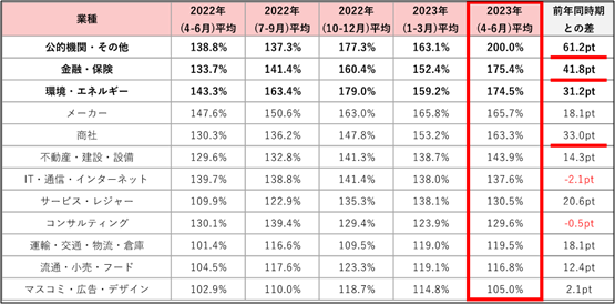 2023年4-6月は2023年1-3月と比べて、経験者求人を中心に平均初年度年収が増加し、求人件数は高止まりとなり、企業の採用意欲は引き続き高いことが考えられます。