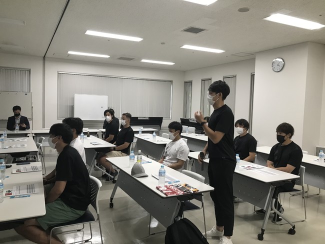 ポーツパフォーマンスや怪我の防止に“噛むこと”が重要であること、食事をよく噛んで食べることのメリット、その他様々な噛むことの効果についての講義がありました。選手たちもみな真剣な面持ちで武田教授の講義に耳を傾けていました。