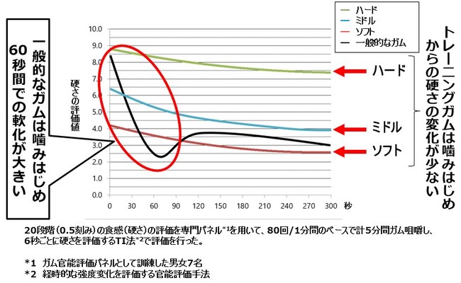 一般的なガムは、噛んでいくにつれて、硬さが大きく変化するのに比べ、アスリート専用トレーニングガムは、噛みはじめからの硬さの変化が少ない特別な設計となっています。噛んでいる間中、しっかりとした噛み応えが続くことで、噛むことのトレーニングに適しています。