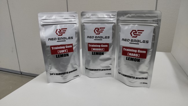 最後、測定を終えた選手に、“噛む”トレーニングのツールとして、レッドイーグルス北海道専用のトレーニングガムを提供しました。チームロゴをあしらったオリジナルのガムを手に選手たちは「早速ガムを噛み練習に取り掛かります」と笑顔で話していました。
