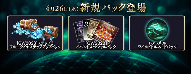 本アップデートでは、ブルーダイヤをお得に獲得できるゴールデンウィークを記念した3種類の「[GW2023]ステップブルーダイヤステップアップパック」や、「スキルブック:ワイルドトルネード」が入った「レアスキルワイルドトルネードパック」などを追加しています。