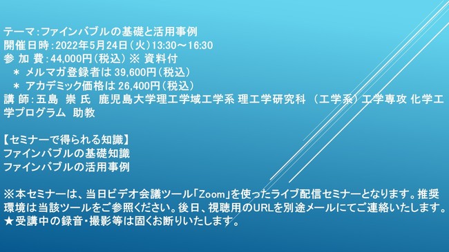 ※ 本セミナーは、当日ビデオ会議ツール「Zoom」を使ったライブ配信セミナーとなります。推奨環境は当該ツールをご参照ください。後日、視聴用のURLを別途メールにてご連絡いたします。