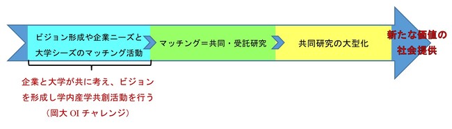 岡大OIチャレンジは、新しいビジョン形成や企業ニーズと大学シーズの掘り起こし、予想しない新知見の獲得などから既存事業育成(1→10)だけではなく、新規事業創出(0→1)などに取り組める「共創の場」を手にすることができます。