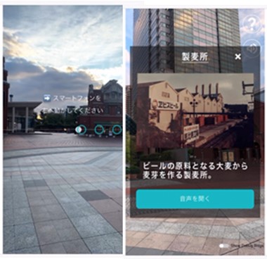 恵比寿ガーデンプレイスの対象スポットでスマートフォンをかざすと、ヱビス(恵比寿)の歴史を写真とナレーションでお届けします。位置情報を元に街の奥行きを認識するVPS(Visual Positioning Service)技術を活用し、空間にARによって再現します。