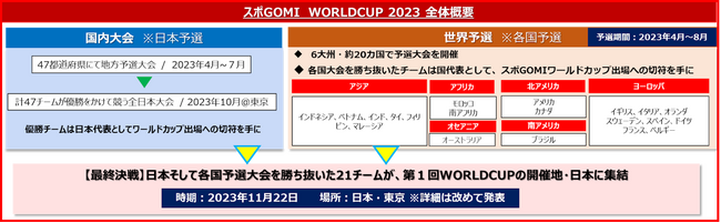 本チームは、2023年10月に東京都内での開催を予定している、全国47都道府県の予選大会を勝ち抜いたチームが出場する全日本大会「スポGOMI ワールドカップ 2023 日本 STAGE」に進出。2023年11月に日本で開催予定で、日本を含め世界21カ国の代表が集う「スポGOMI ワールドカップ 2023」への出場を目指します。