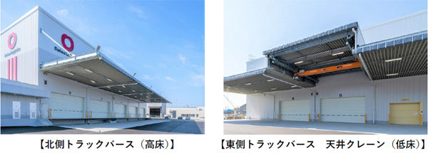 本センターは、北側をカゴ台車などの入出庫作業に適した高床式、東側を重量物の保管・荷役にも対応できる低床式とした、ハイブリッド式バース(※3)を採用しているため、建材・産業機器といった重量物から、細かな流通加工や衛生管理をともなう消費財まで、さまざまな貨物の取り扱いが可能です。また、天井クレーンを設置しているため、大型製品や長尺物、異形物などの入出荷にも対応します。