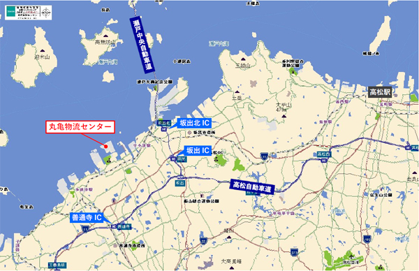 本センターは、瀬戸中央自動車道「坂出北インターチェンジ」から約8.6km、「坂出インターチェンジ」から約8.8km、高松自動車道「善通寺インターチェンジ」から約8.4kmに位置し、四国エリア全域に車で3時間30分以内にアクセスできる広域配送拠点として最適な場所に位置します。