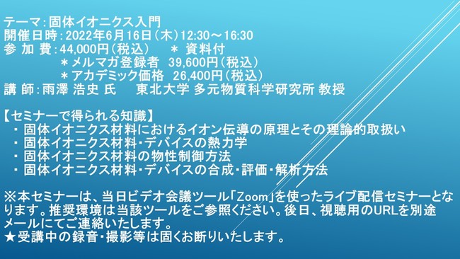先端技術情報や市場情報を提供している(株)シーエムシー・リサーチ(千代田区神田錦町: https://cmcre.com/ )では、 各種材料・化学品などの市場動向・技術動向のセミナーや書籍発行を行っておりますが、 このたび「固体イオニクス入門」と題するセミナーを、 講師に雨澤 浩史 氏 東北大学 多元物質科学研究所 教授)をお迎えし、2021年6月16日(木)13:30より、 ZOOMを利用したライブ配信で開催いたします。 受講料は、 一般:44,000円(税込)、 弊社メルマガ会員:39,600円(税込)、 アカデミック価格は26,400円(税込)となっております(資料付)。
