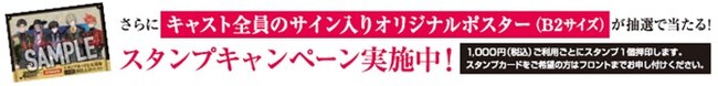 また、1,000円毎(税込)に1個押印するスタンプカードをお渡しし、スタンプ6個を貯めて応募すると、抽選で5名様にキャスト全員のサイン入りオリジナルポスター(B2サイズ)をプレゼント。