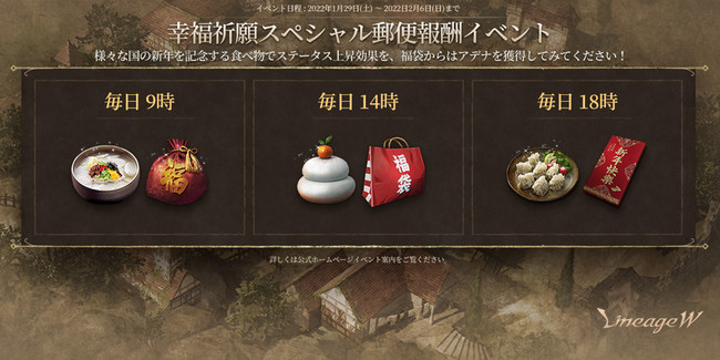 旧正月を記念して、Lv20以上のキャラクターを対象とし、ステータス上昇効果のある各国の新年を記念する料理と、アデナを獲得できる福袋を郵便報酬で毎日9時、14時、18時にお送りします。