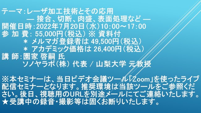 先端技術情報や市場情報を提供している(株)シーエムシー・リサーチ(千代田区神田錦町: https://cmcre.com/ )では、 各種材料・化学品などの市場動向・技術動向のセミナーや書籍発行を行っておりますが、 このたび「レーザ加工技術とその応用 ― 接合、切断、肉盛、表面処理など ―」と題するセミナーを、 講師に園家 啓嗣 氏 ソノヤラボ(株) 代表 / 山梨大学 元教授)をお迎えし、2022年7月20日(水)10:00より、 ZOOMを利用したライブ配信で開催いたします。 受講料は、 一般:55,000円(税込)、 弊社メルマガ会員:49,500円(税込)、 アカデミック価格は26,400円(税込)となっております(資料付)。
