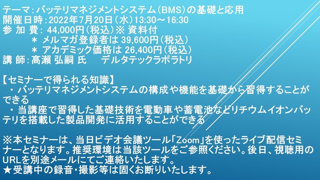 先端技術情報や市場情報を提供している(株)シーエムシー・リサーチ(千代田区神田錦町: https://cmcre.com/ )では、 各種材料・化学品などの市場動向・技術動向のセミナーや書籍発行を行っておりますが、 このたび「バッテリマネジメントシステム(BMS)の基礎と応用」と題するセミナーを、 講師に高瀬 弘嗣 氏 デルタテックラボラトリ)をお迎えし、2022年7月20日(水)13:30より、 ZOOMを利用したライブ配信で開催いたします。 受講料は、 一般:44,000円(税込)、 弊社メルマガ会員:39,600円(税込)、 アカデミック価格は26,400円(税込)となっております(資料付)。
