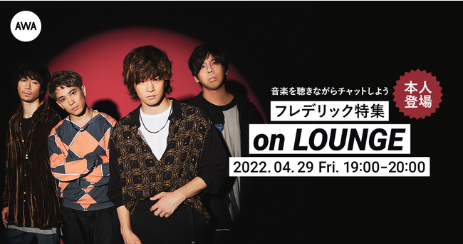 AWA株式会社(本社:東京都港区、代表取締役CEO:冨樫晃己)が運営する、サブスクリプション型(定額制)音楽ストリーミングサービス「AWA(アワ)」は、2022年4月29日(金) 19:00〜20:00の1時間に渡り、オンライン空間「LOUNGE(ラウンジ)」で、フレデリックのメンバー登場イベントを開催いたします。