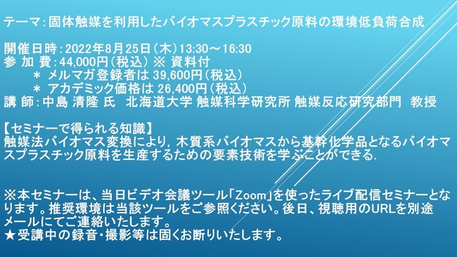 【ライブ配信セミナー】固体触媒を利用したバイオマスプラスチック原料の環境低負荷合成 8月25日(木)開催 主催:(株)シーエムシー・リサーチ