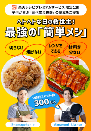 楽天グループ株式会社が運営するレシピサイト「楽天レシピ」は、「楽天レシピ プレミアムサービス」(以下「本プラン」)で提供する「献立機能」において、SNS総フォロワー数300万人を超える(注1)人気料理研究家の「ハマごはん【お手軽レシピ】」さんと「まるみキッチン」さんが考案した献立の限定公開を開始しました。