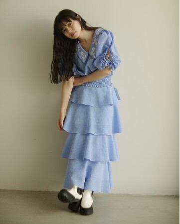 スカートはフレアで表現したティアードが柔らかい印象を与え、華やかさを演出します。