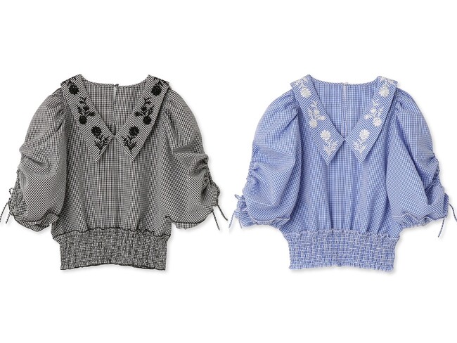 ブラウスは衿部分にフラワーブーケ柄のオリジナル刺繍を施し、袖に入ったスリットはリボンで絞り加減を調節可能。