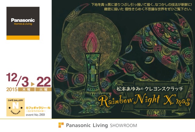 パナソニック株式会社 エコソリューションズ社(以下、パナソニック)は、住宅設備総合ショウルームである「パナソニック リビング ショウルーム 広島」(広島県広島市中区中町7-1)の2階 喫茶内のギャラリーコーナー「カフェギャラリー・N」において、2015年12月3日(木)より12月22日(火)まで、「松本あゆみのクレヨンスクラッチ『レインボー ナイト クリスマス』」を開催します。
