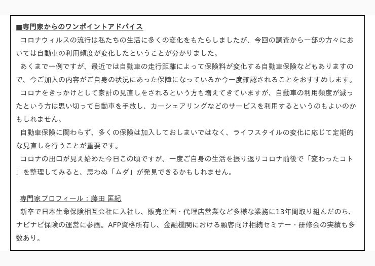 今回の調査からも分かるように、新型コロナウイルスによって、人々の自動車利用の在り方は大きく変化し、それに伴い備えるべきリスクの内容も変わっている可能性があります。