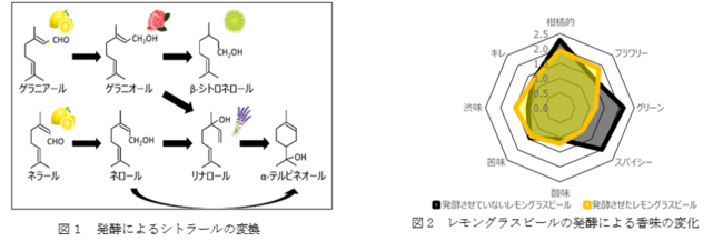 発酵後には、シトラールはほとんどなくなっていましたが、そのビールからは発酵させていないレモングラスを添加したビールと同じくらい、レモンの香りがしっかりと感じられました(図2)。発酵により生成した成分のうち、リナロールとゲラニオールとβ-シトロネロールの組み合わせではレモン、ライムのような香りを感じることがホップ研究で解明されており、それらの成分がシトラールと交代するような形でレモンの香りを担っていたことが官能検査と香り成分の追跡によって明らかとなりました。