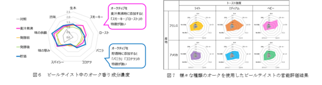 オークチップを添加したビールテイストについて官能評価を実施したところ、添加するタイミングによって香味特徴に違いがあることが分かりました。なかでも特徴的なものとして、麦汁煮沸時に添加したビールテイストでは「スモーキー」「ロースト」の特徴が強く、貯酒時に添加したビールテイストでは「バニラ」、「ココナツ」の特徴が強いという傾向がみられました(図6)。麦汁煮沸時にオークチップを添加した例は本研究が初めてであり、様々な香味のビールテイストをつくる新たな方法として今後活用されることが期待されます。また、麦汁煮沸時にオークチップを添加する方法を用いて、様々な種類のオークチップを用いた試験を実施しました。産地やトースト強度の異なるチップを添加したところ、チップの種類のよってもビールテイストの味や香りを変えられることが明らかとなりました(図7)。