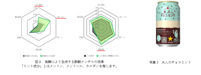 ミントには、メントールとよばれる清涼感をもつ成分が含まれています。ミントを加えてビールを醸造したところ、酵母の発酵の作用でメントールの一部が酢酸メンチルという別の香り成分に変換されることが分かりました。酢酸メンチルそのものも甘く、フルーティーな香りを持っていますが、官能検査によって、この成分には他のミントの香り成分の清涼感を増強させる効果があるということを明らかにしました(図3)。なお、HOPPIN’ GARAGEにて数量限定発売した「大人のチョコミント」(写真3)にはこの研究成果が活用されています。