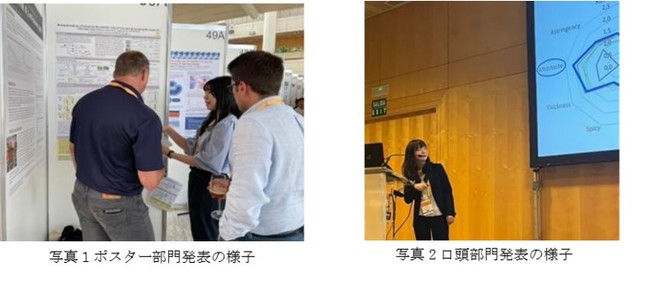 ポスター発表(写真1)では、近年クラフトビール等で話題になりつつあるハーブやスパイスを加えて発酵について、発酵による酵母の働きでハーブやスパイスの香り成分が変化すること、また、発酵させることで単にハーブやスパイスを加えただけでは作ることのできない香味になり得ることを発表しました。
