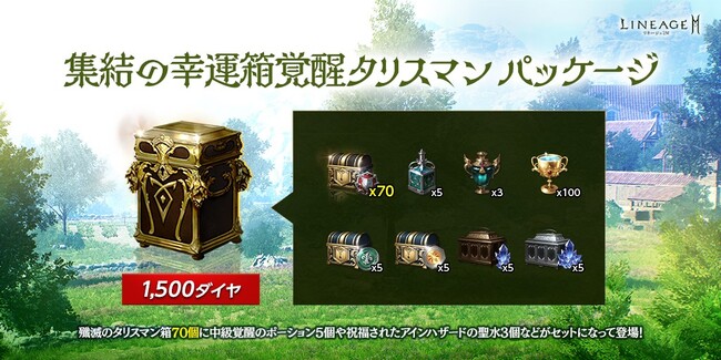 「殲滅のタリスマン箱(刻印)」70個や、「光る名誉の勲章幸運箱(刻印)」5個、「光る啓示の証幸運箱(刻印)」5個、「祝福されたアインハザードの聖水(刻印)」3個、「中級覚醒のポーション(刻印)」5個などがセットになった「集結の幸運箱覚醒タリスマン パッケージ」が登場しました。