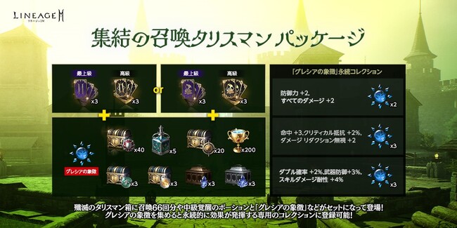 「殲滅のタリスマン箱(刻印)」40個に、クラスまたはアガシオンの召喚66回分、「中級覚醒のポーション(刻印)」5個、「グレシアの象徴(刻印)」1個などがセットになった「集結の召喚タリスマン パッケージ」が登場しました。