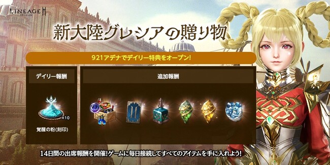 期間中、921アデナを使用することでオープンできる出席報酬「新大陸グレシアの贈り物」が登場しました。