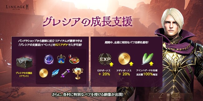 さらに、期間中の獲得EXPやアデナ獲得量が20%増加するほか、アインハザードの祝福追加量増加が100%になります。