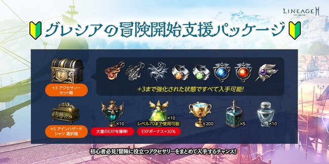 「殲滅の+3アクセサリー セット箱(刻印)」1個、「殲滅の+5アインハザード シャツ選択箱(刻印)」1個、「祝福されたアインハザードの聖水(刻印)」10個、「殲滅の快速成長のウィンド ポーション(レベル70)」10個などがセットになった「グレシアの冒険開始支援パッケージ」が登場しました。