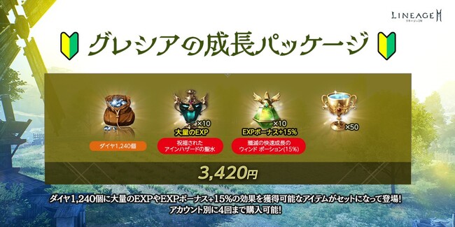 ダイヤ1,240個と、「祝福されたアインハザードの聖水(刻印)」10個、「殲滅の快速成長のウィンドポーション(15%)(刻印)」10個、「祝福の聖物」50個がセットになった「グレシアの成長パッケージ」が登場しました。